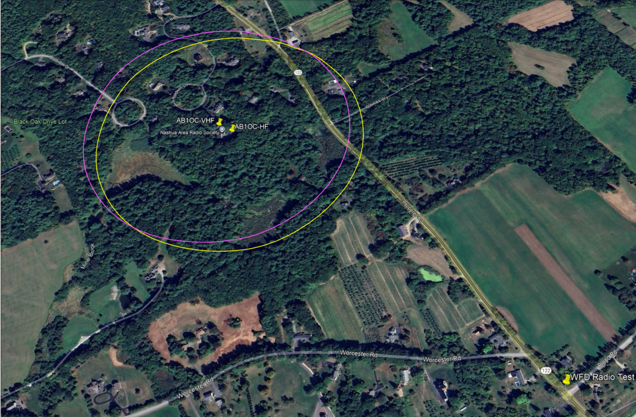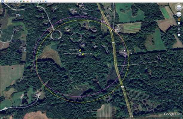 As part of the planning and to address these problems, we decided to send a Roving team to serve as the club’s three contacts. Rules dictate that contacts must be outside a 1000 ft circle from the Field Day base of operation. I started by using Google Earth Pro, setting the coordinates for AB1OC QTH and using the circle ruler to determine our 1000-foot perimeter. The two circles represent the VFH and HF Towers location.