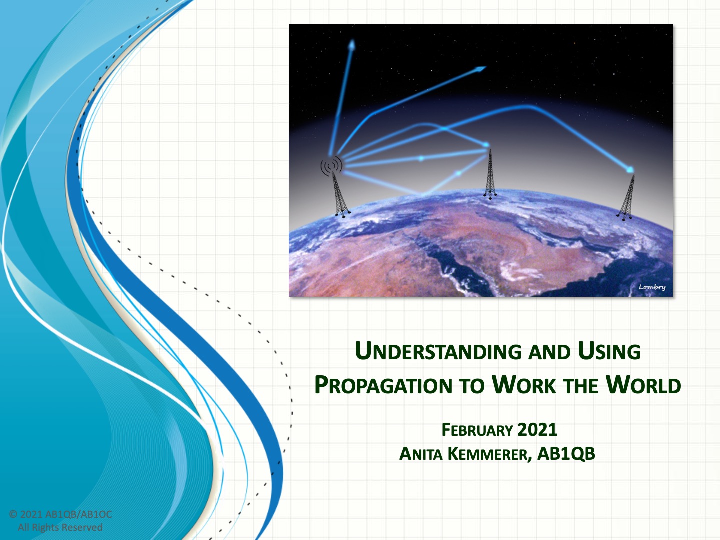 The video and presentation from our February 2021 Tech Night – Understanding and Using Propagation to Work The World by Anita, AB1QB, is available on our Tech Night page to Members and Internet Subscribers.