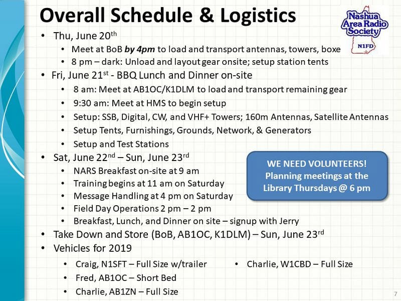 Field Day 2019 is finally here! We will begin setting up on-site at HMS tonight (Thursday) at 8 pm – rain or shine. Our goal for tonight will be to get our tents up and to get the tower bases located and staked. We’ll resume setup on Friday morning at HMS starting at 9:30 am rain or shine with transport activities taking place earlier in the morning per Craig’s schedule.