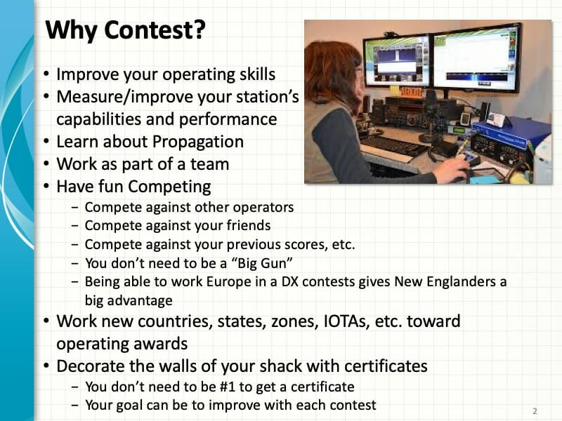 The video and presentation from our January Tech Night – Getting Started in Contesting are available on our Tech Night page to Members and Internet Subscribers. Don’t forget to log in to n1fd.org to see the materials.