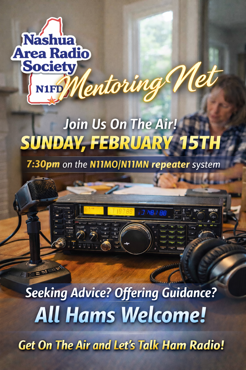 Join our VHF Repeater Net this Sunday, where Fred, AB1OC will host a Mentoring Net. Our past mentoring nets have been popular. Each checked-in station can ask a question or answer a previously asked question. We will go around the net 2-3 times until the questions are answered.