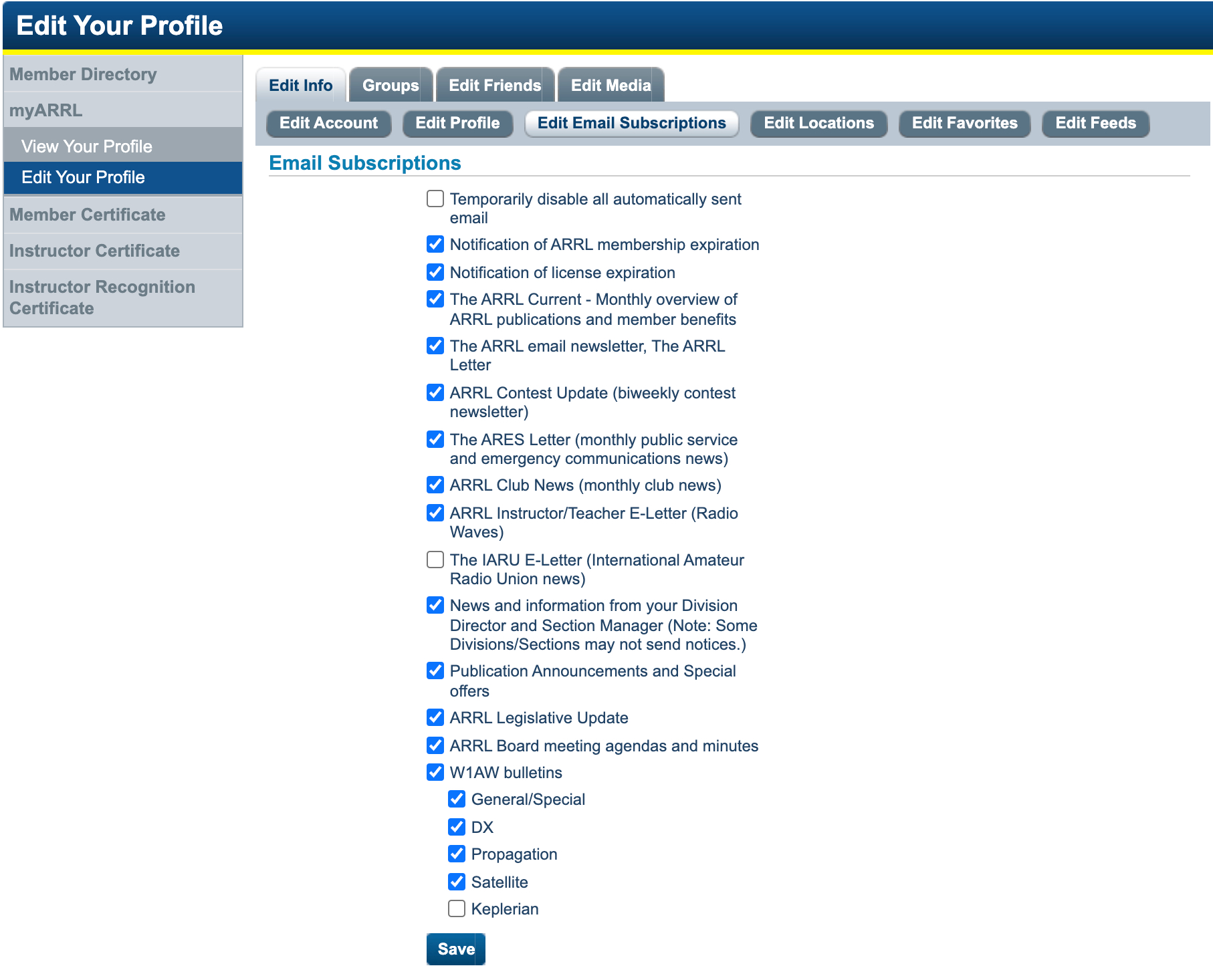 - Select the “Edit Your Profile” choice under “myARRL” on the menu at the left of your profile page