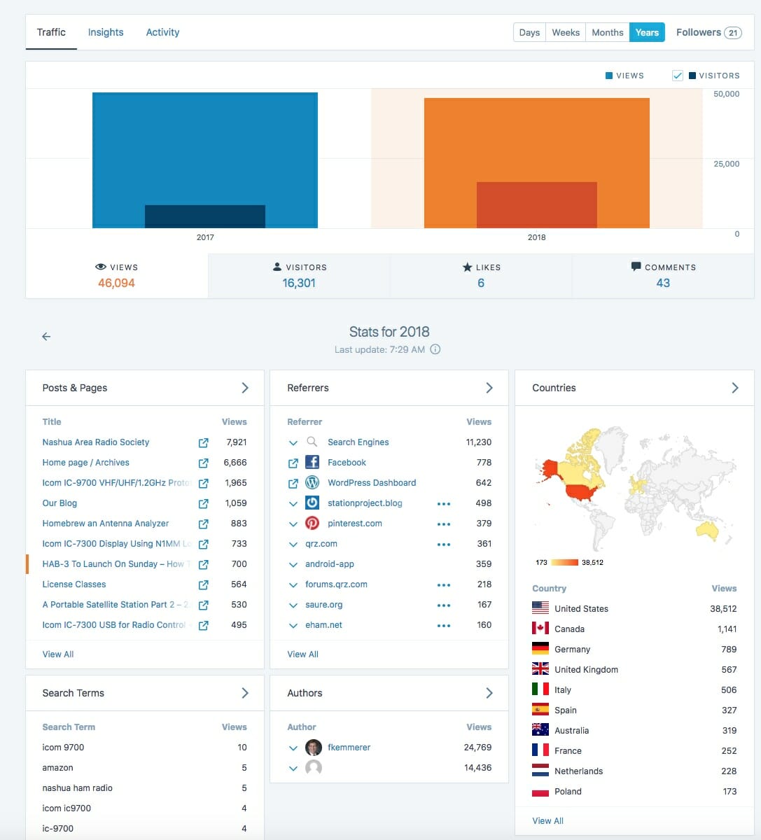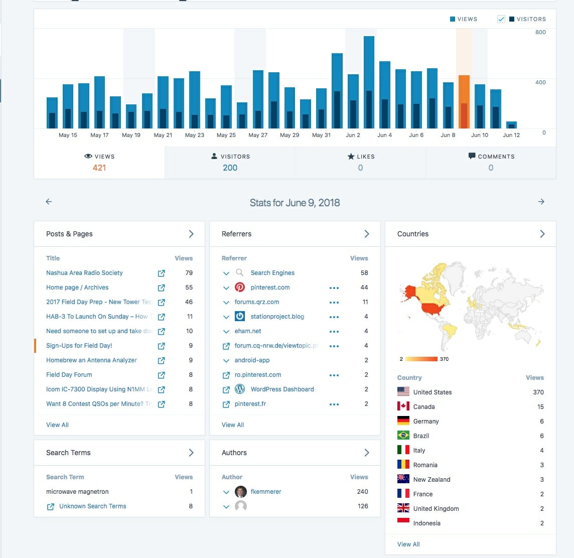 Thanks to all of the members of the Nashua Area Radio Society’s contributions, we have built a worldwide interest in our website within the Amateur Radio community. The graphic above shows the activity on our website for a typical day during this month (June 2018). We enjoy about 200 visitors on a typical day and folks view a little over 400 articles, forum posts, and pages on our website during a typical day. While most visitors are U.S. based, we are seeing an increasing interest from visitors around the world.