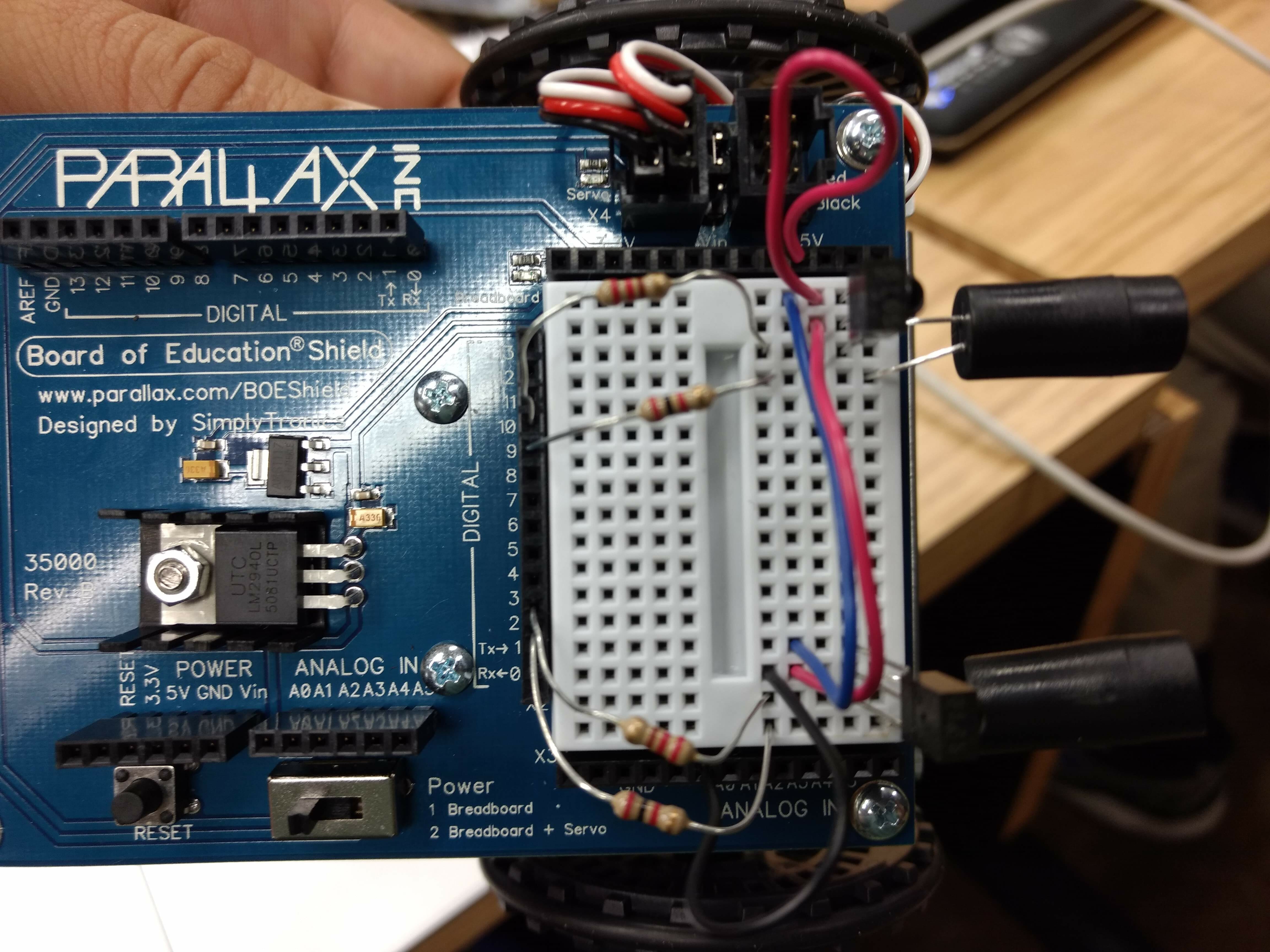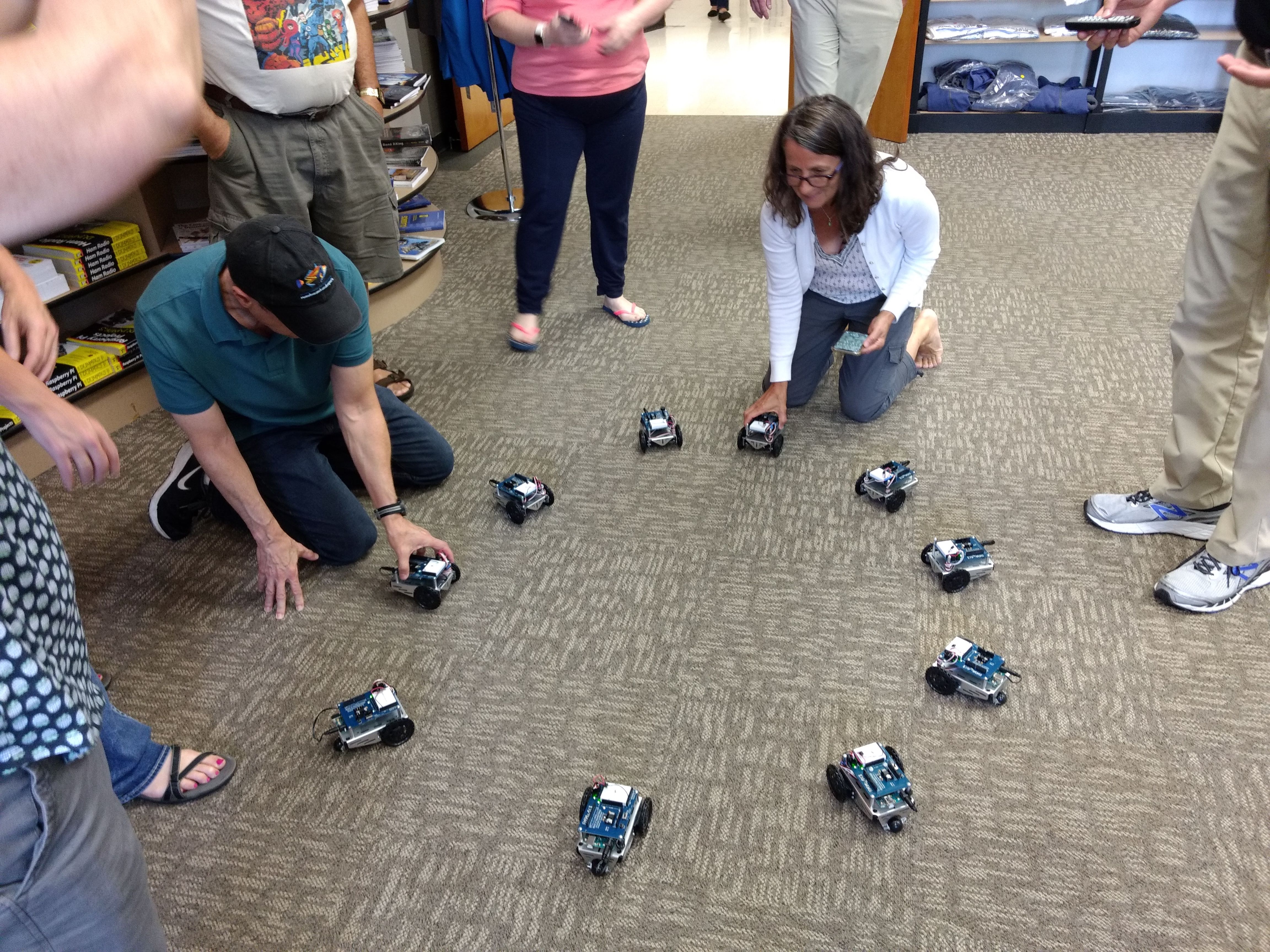 Day four and five concentrated more on the coding of the robots and the science behind infrared remote controllers that would ultimately allow us to drive our robots with a Sony TV remote. Teachers learned to program the Arduino to display numeric digits 0 through 9 in progression, learned how to get their robots to move forward, backward, turn left, and turn right, program their robots with several lines of code to run a maze, and then learned to program the robots to be able to avoid obstacles through the use of LED sensors and other sensors like those used to collect data for APRS packets. By the end of day five the participants were able to circle their robots together in the lobby of ARRL and have Tommy use one Sony remote to orchestrate the robots doing the Hokey Pokey.